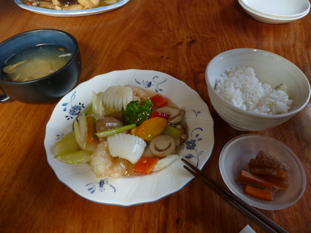 (写真A)海鮮野菜炒め・きのこスープ・お新香・白飯