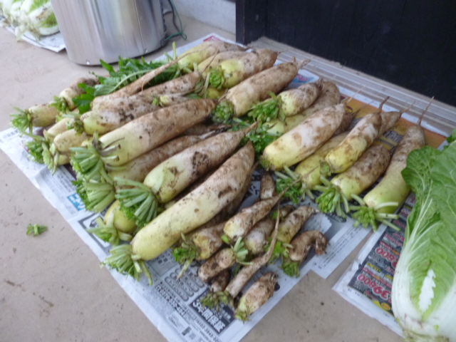 帰宅後ご夫婦は移住仲間と白菜&大根(写真)の収穫をした、