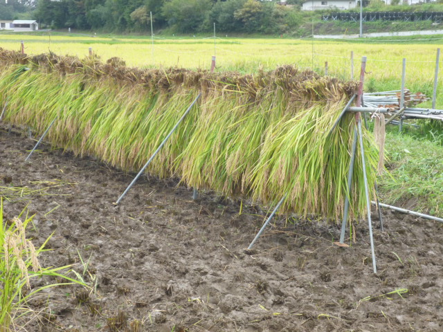 はざがけを設置して結束した稲を2段にかけた(写真@A)だワン