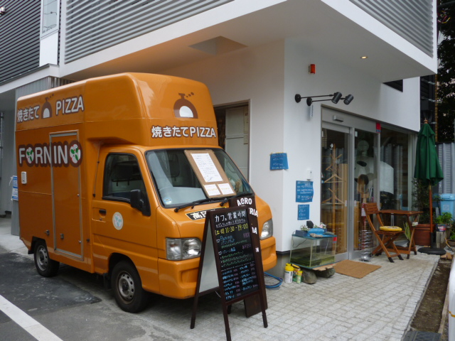 (写真B)1階ピザ店入口・・・ピザカーが可愛い
