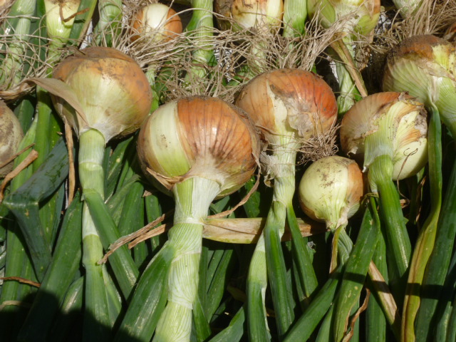 収穫して天日干ししていた玉葱を保存用に吊るした(写真@)だワン