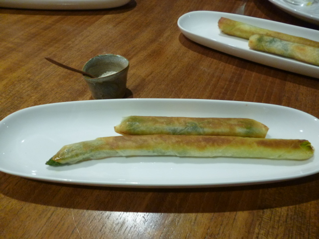 (写真B)前菜(写真C)アスパラ・エビの春巻きから