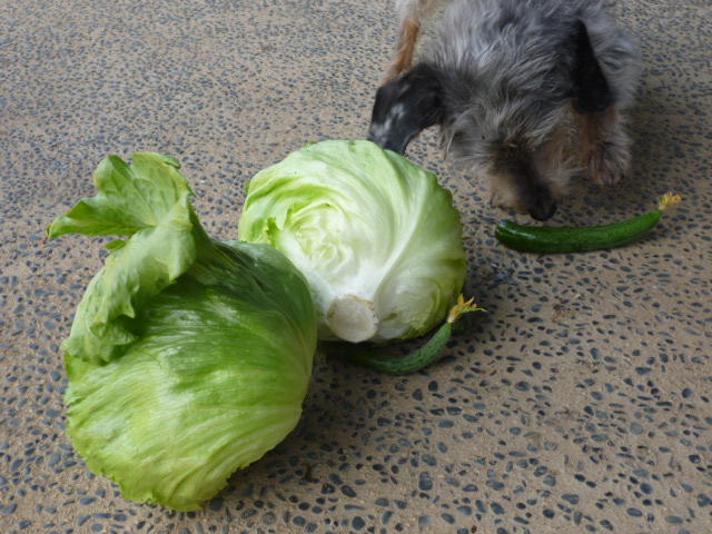 写真の家庭菜園で育てた、新鮮なレタスと胡瓜を収穫しただワン