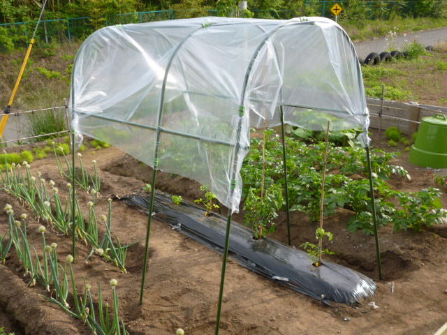 家庭菜園用雨よけ(写真)を購入して下にトマト🍅を、隣に頂いた鷹の爪も植えただワン