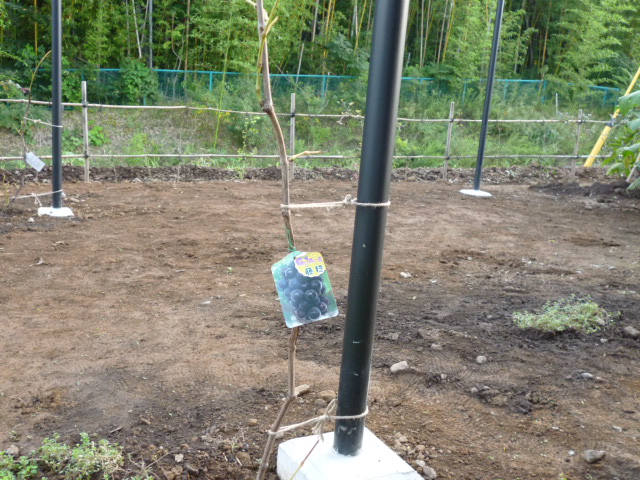 ぶどう棚に種類の違う2本の苗木