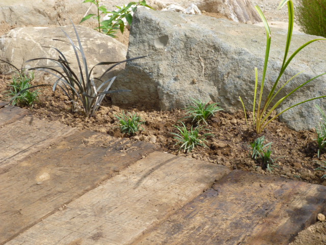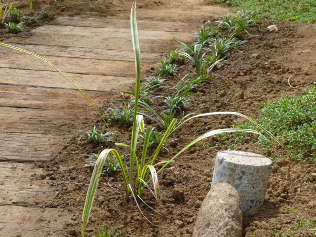 写真AB枕木の横に「タマリュウ」「リュウノヒゲ」
