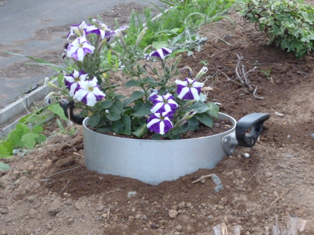 庭に花を植えましたが、IHに対応できない鍋を鉢代わりに再利用しただワン