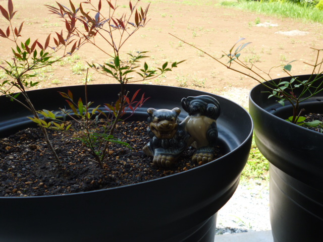 B玄関前のナンテンの鉢に「シーサーの置物」