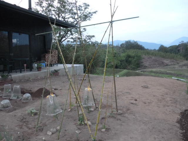 ゴウヤ&キュウリ用に取付けた緑のカーテンだワン。