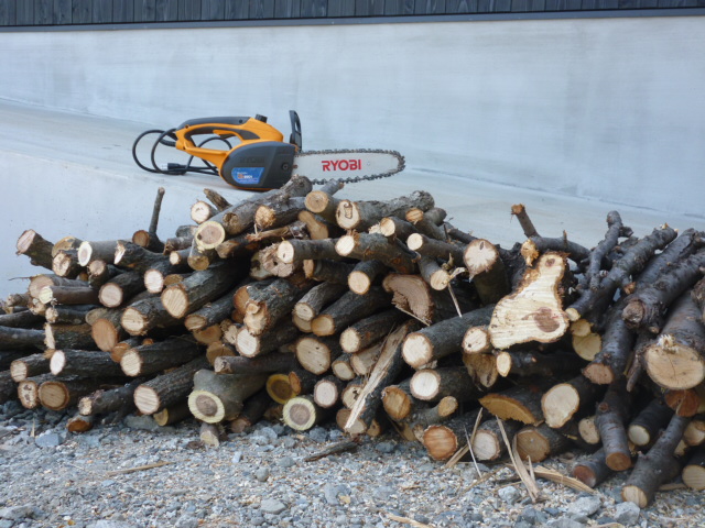 電気チェーンソーもお借りしたので、少しですが薪づくりをしたのだワン。