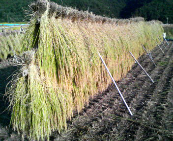 翌日早朝、降りが強くなりそうな気配の雨の中、残りの刈り取った稲を干す作業を急いだ。