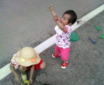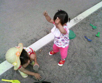 お姉ちゃんに砂をかけようした決定的瞬間です。