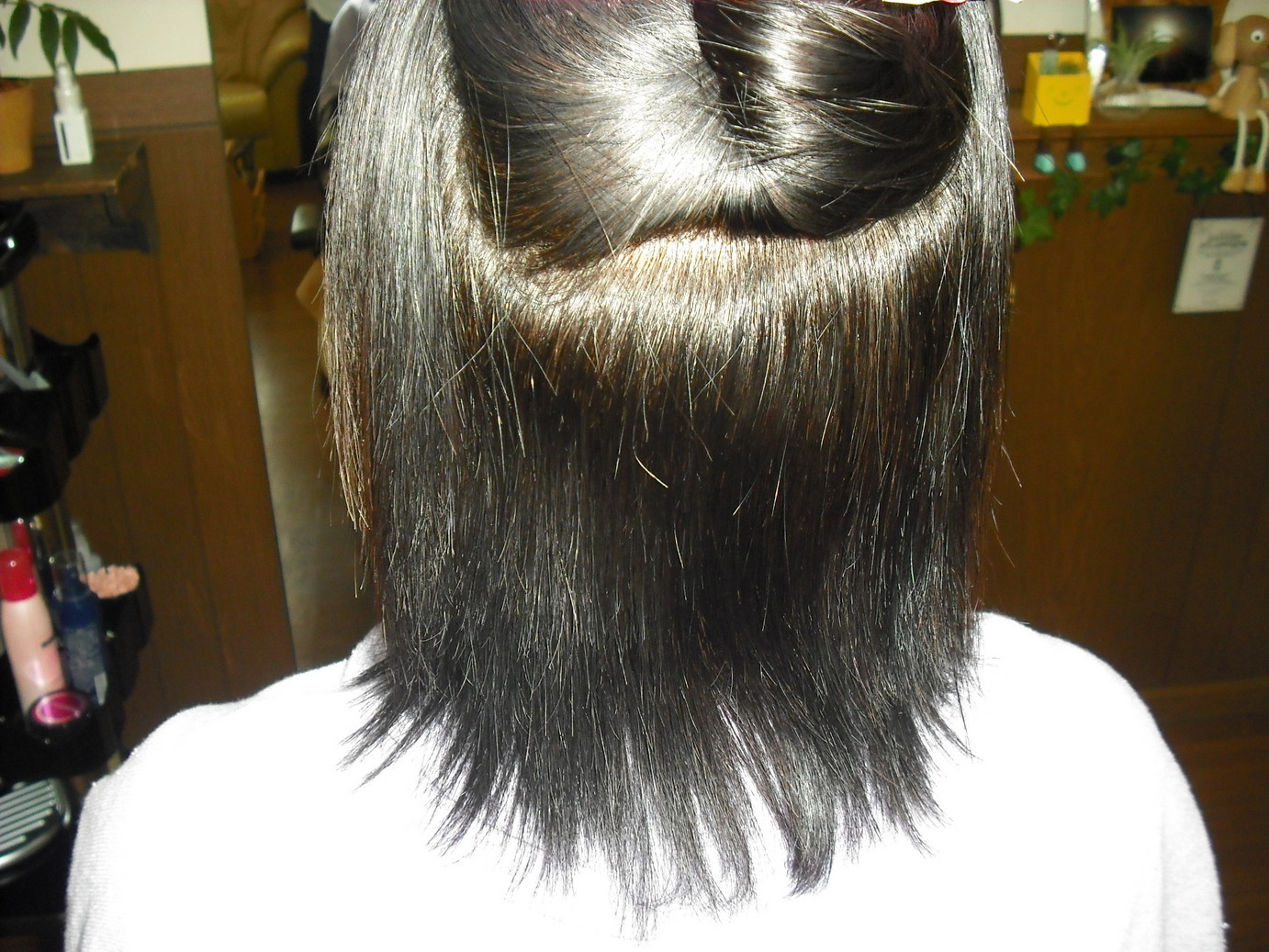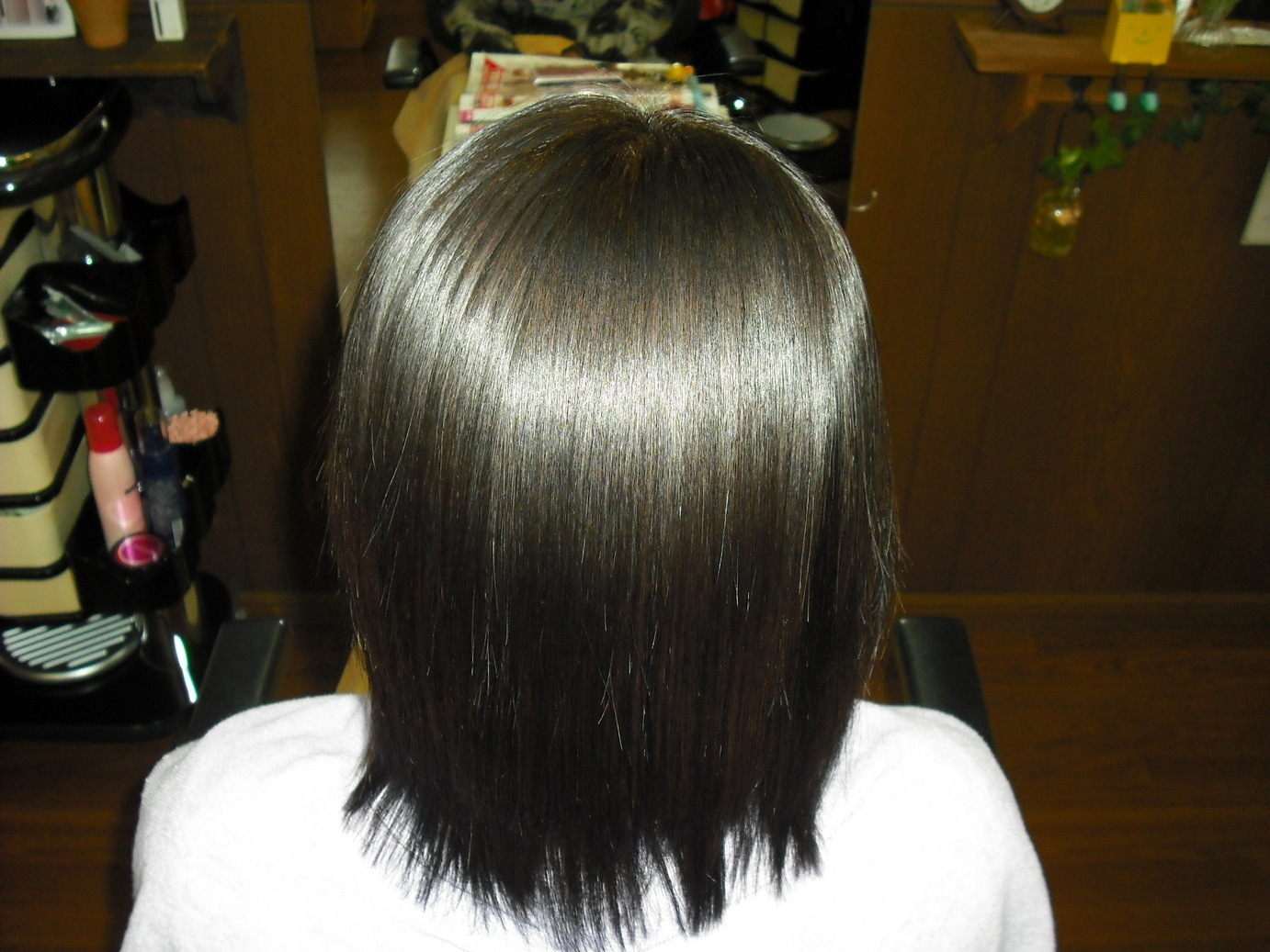 | ミコノス縮毛矯正トーリトメント | | | 11月21日昭和町Sさん 1年ぶりのストレートです くせが強くいつも 延びにくい髪で 非常に痛みやすい髪ですが 今回は写真のとおり 最高の出来でした 本人も大喜びでした 縮毛矯正&ヘナ 所要時間4時間 ¥21,000 |