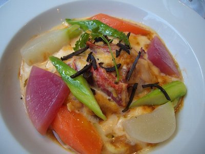 オマール海老のグラタン 玉葱のロワイヤル 季節の野菜トリュフ風味(海老がレアで美味しい)