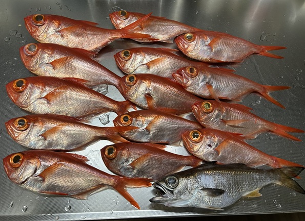 今週末は天気・風共に問題なさそうなので 金目へ出掛けて見ました 前回リールが壊れて船のリールを借りて何とか釣りになったので良かったのですが 壊れた電動リールは直りそうもないので シマノの6000番を購入 せっかく買ったので早速試しに出掛けた感じ!1時半起床で小田原へ 何時もの山中の気温はマイナス4℃ 今日は冷え込みが一段落する予報 船宿は小田原のO丸にお世話になりました 現着すると左の舳しか空いていなくて 舳に決定 定刻で岸払いして何時もの真鶴方面へ 現地では既に2船が始めていて その横で開始 軽く潮回りして1投目 当たり無し 前回はモーニングがあったのですが今日は厳しい!2投目か3投目に一家で金目が釣れて その後は中々当たりがありません しばらく投入を繰り返しましたが良い所がないので 大きく移動して湯河原沖へ ここのポイントではたまに5点掛けもあって 終わって見れば何時もと同じ様な釣果となりました 今日は晴天で暖かな一日 富士山も綺麗に出てました |
