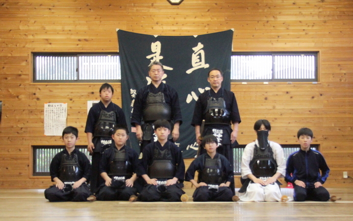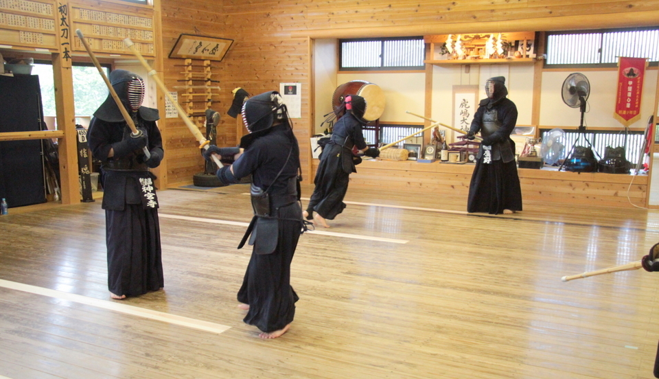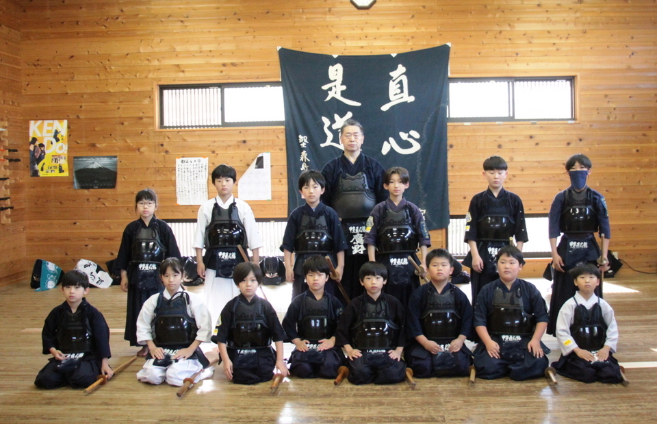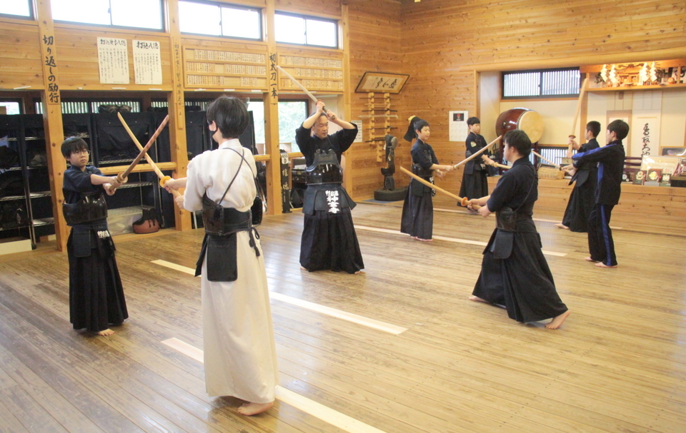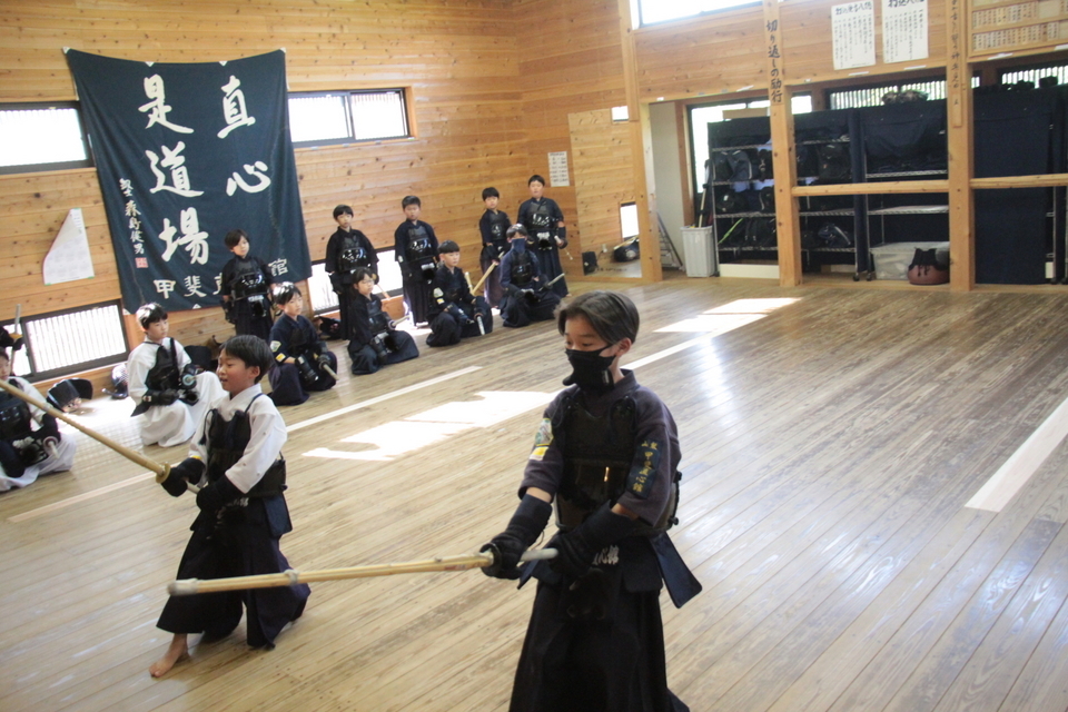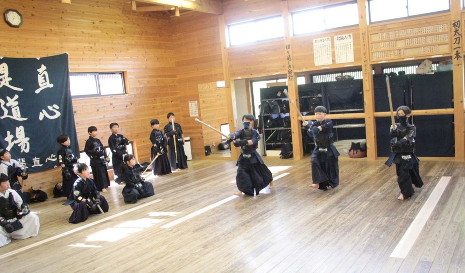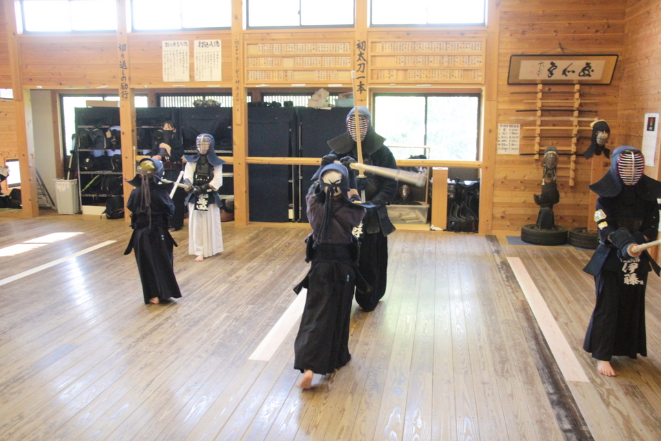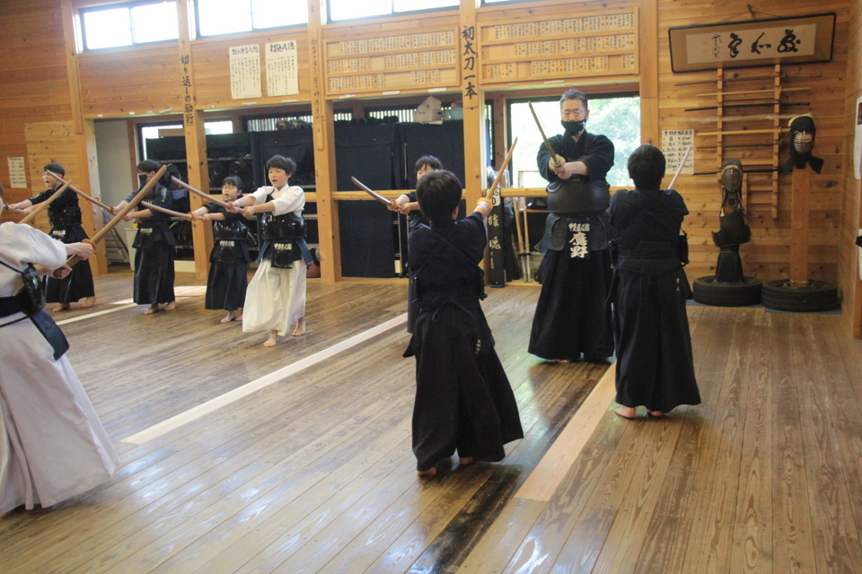 それぞれの技の稽古の前には小学生や指導者がお手本を見せてから稽古しましたが、引き技がしっかり打てている館生はまだ3人ほどで、半分以下です。 この後、指導者2人元立ちによる掛かり稽古を行い、武道場に稽古場所を移して30秒一本勝負をしました。お互いに有効打突があったのかないか判断することも徐々に覚えていきましょう。木刀による剣道基本技稽古法も学びました。