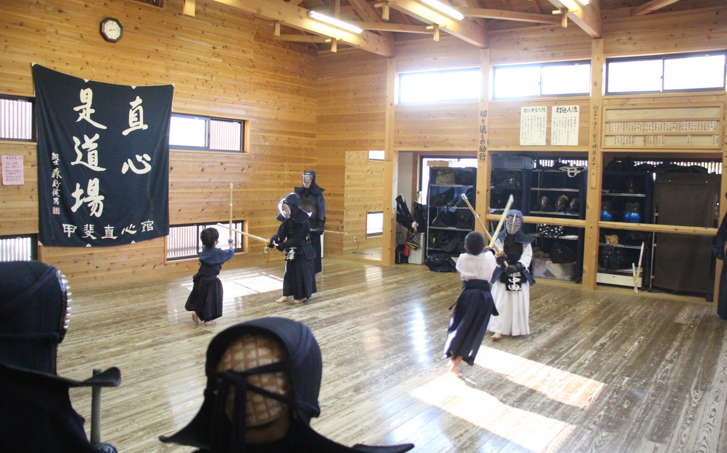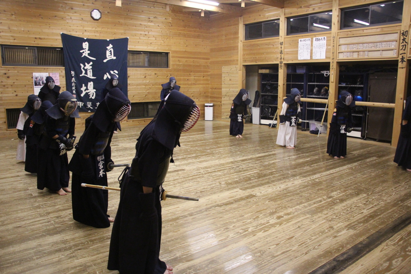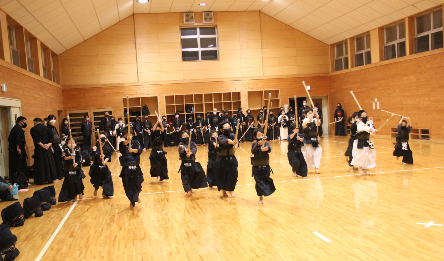 甲斐直心館の朝稽古(小学生以下の部)を11月12日、午前7時から道場で行いました。この日、館生が何人か通う甲斐市内の小学校で授業参観があり、午前6時からの中学生の部の稽古に参加した小学生がいました。この日は館生ら20人、指導者・一般ら5人が参加しました。