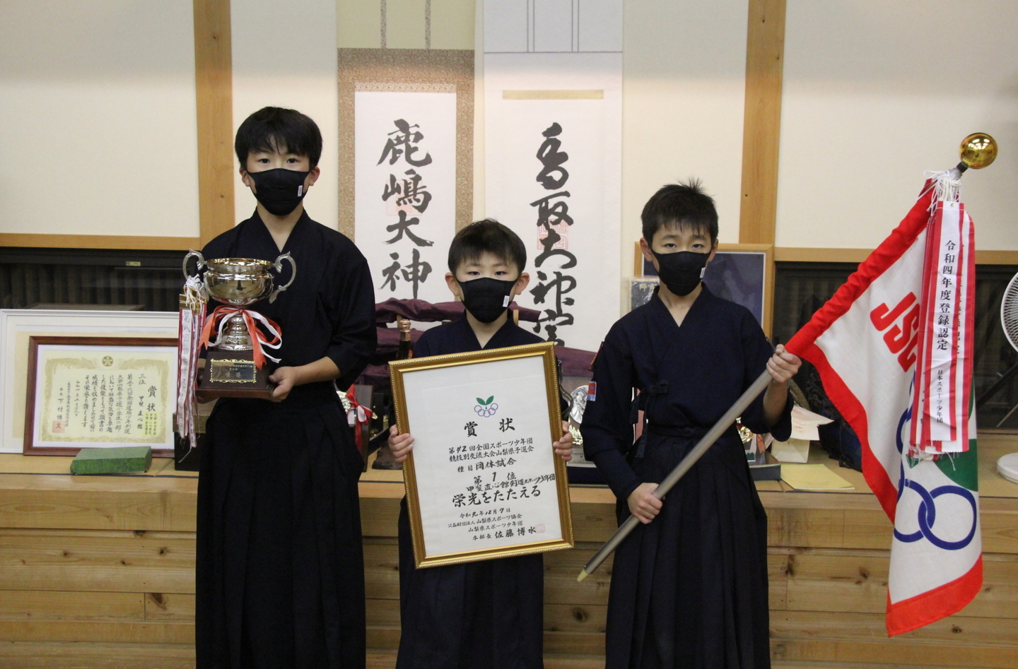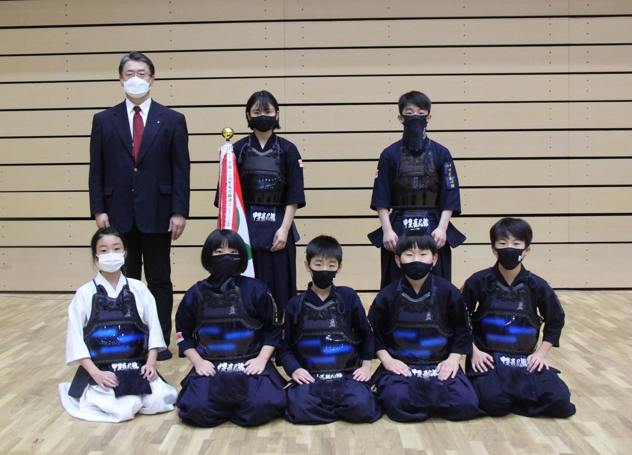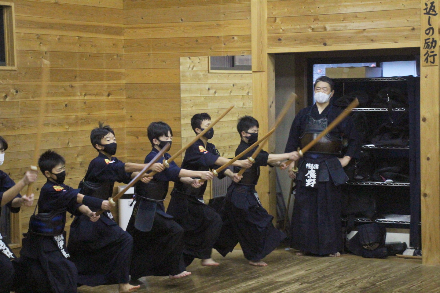 甲斐直心館の朝稽古(小学生以下の部)を11月12日、午前7時から道場で行いました。この日、館生が何人か通う甲斐市内の小学校で授業参観があり、午前6時からの中学生の部の稽古に参加した小学生がいました。この日は館生ら20人、指導者・一般ら5人が参加しました。