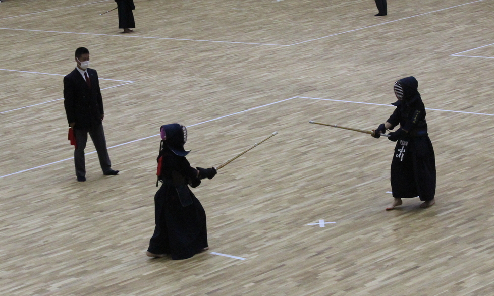 素振りで剣先がしっかり顎の高さまで振り下ろせていない館生が何人かいましたので、水分補給後に、竹刀で跳躍面素振りを、打ち込み竹刀を打つ形で20本ずつ行いました。打つ目標があると、見違えるように手首が返り、打ち込めます。館生には、空間打突の素振りの際でも、想像力を働かせるよう意識することを求めました。