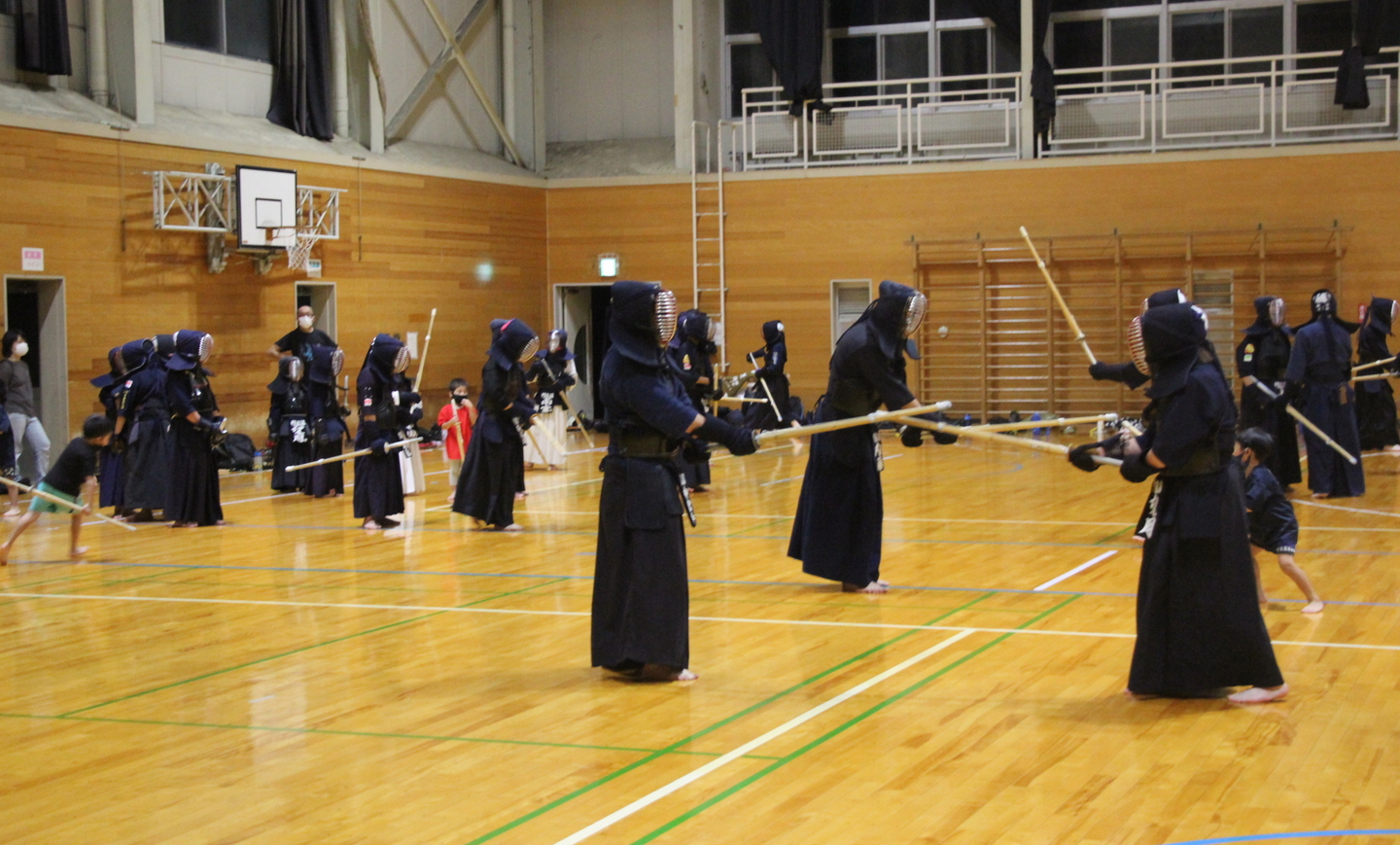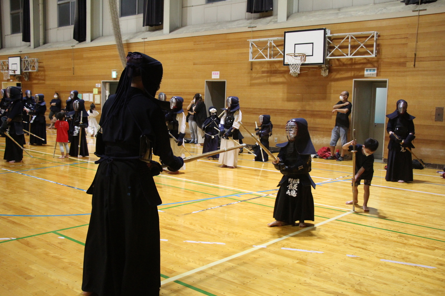 給水休憩を挟んで、指導者3人と剣道経験者の保護者2人、中学生1人が面を着けて計6人が元立ちになり、それぞれ6〜7人ずつ掛かり手となり、面打ち、小手打ち、小手面打ちを4本ずつ、各2〜1セット行いました。低学年や幼児にも光る技が随所に見られましたので、時折、みんなの前で発表してもらい、刺激を受けながら基本打ちに取り組んでもらいました。