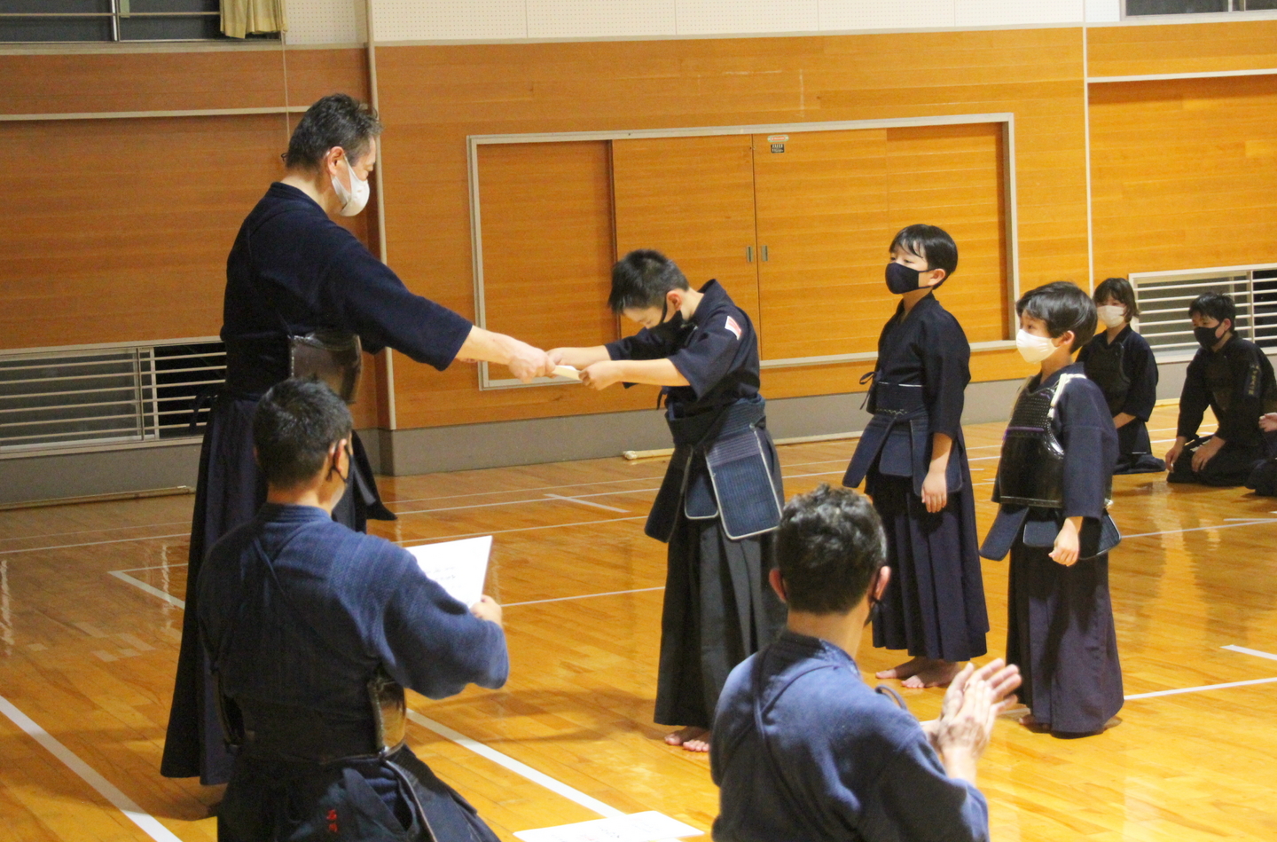 号令は中3長谷部君。正座の後、全日本都道府県対抗少年剣道大会の中学生山梨県代表チームの男子補欠に選ばれた長谷部君に通知書を、また8月7日の本部審査会で昇級した中学生2人に証書を渡しました。それぞれ自分の目標に向かってさらに精進してほしいところです。