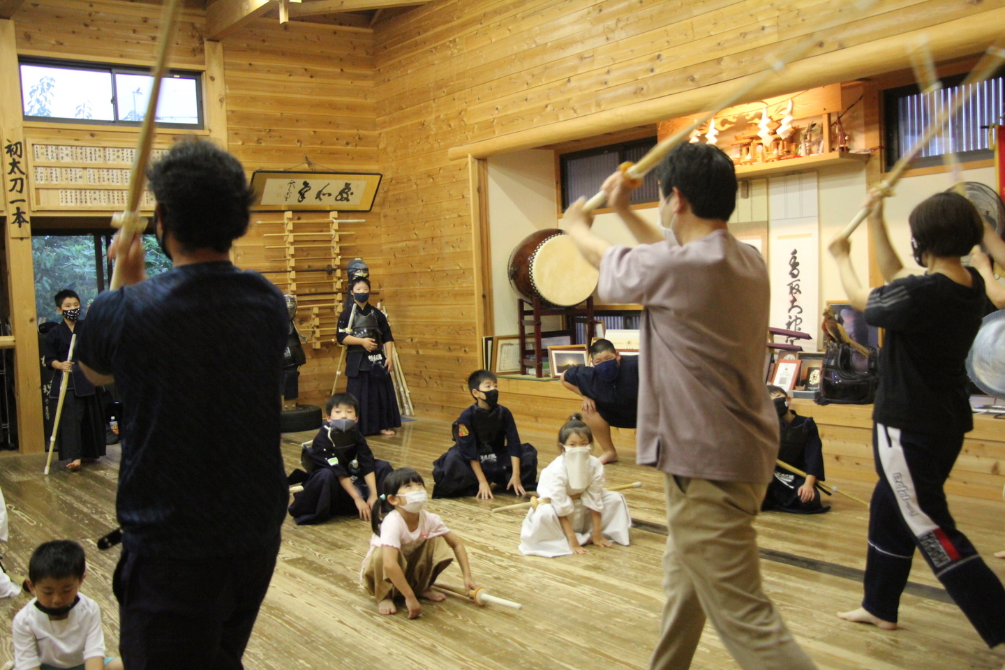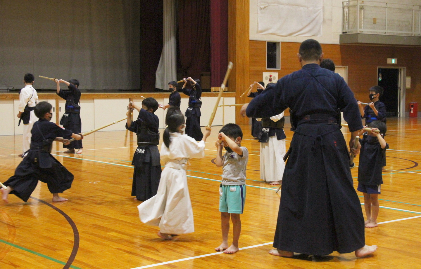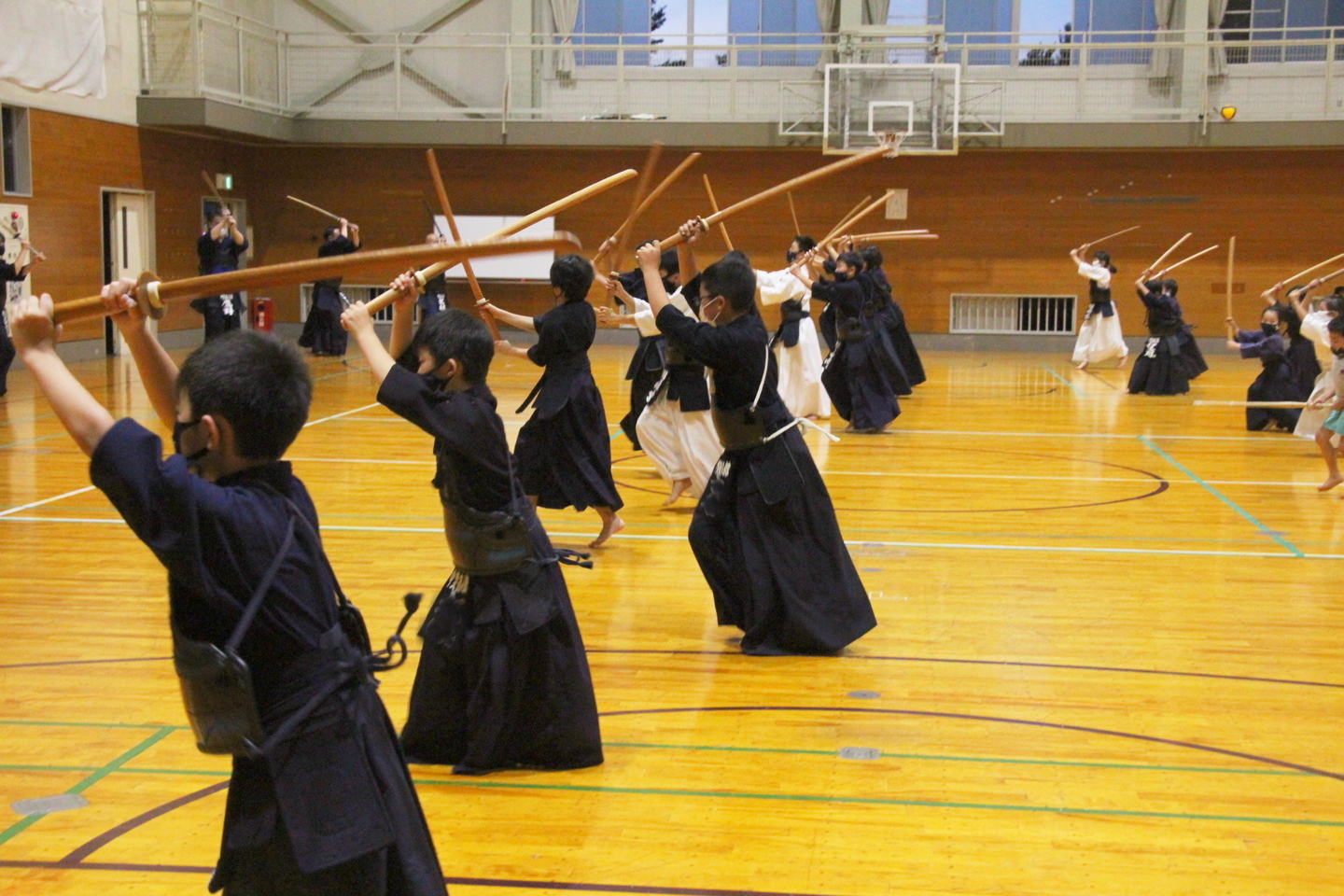 この日は足さばきを行い、前進後退正面素振り、前進後退左右面素振りに取り組み、順次、列ごとに発表しました。