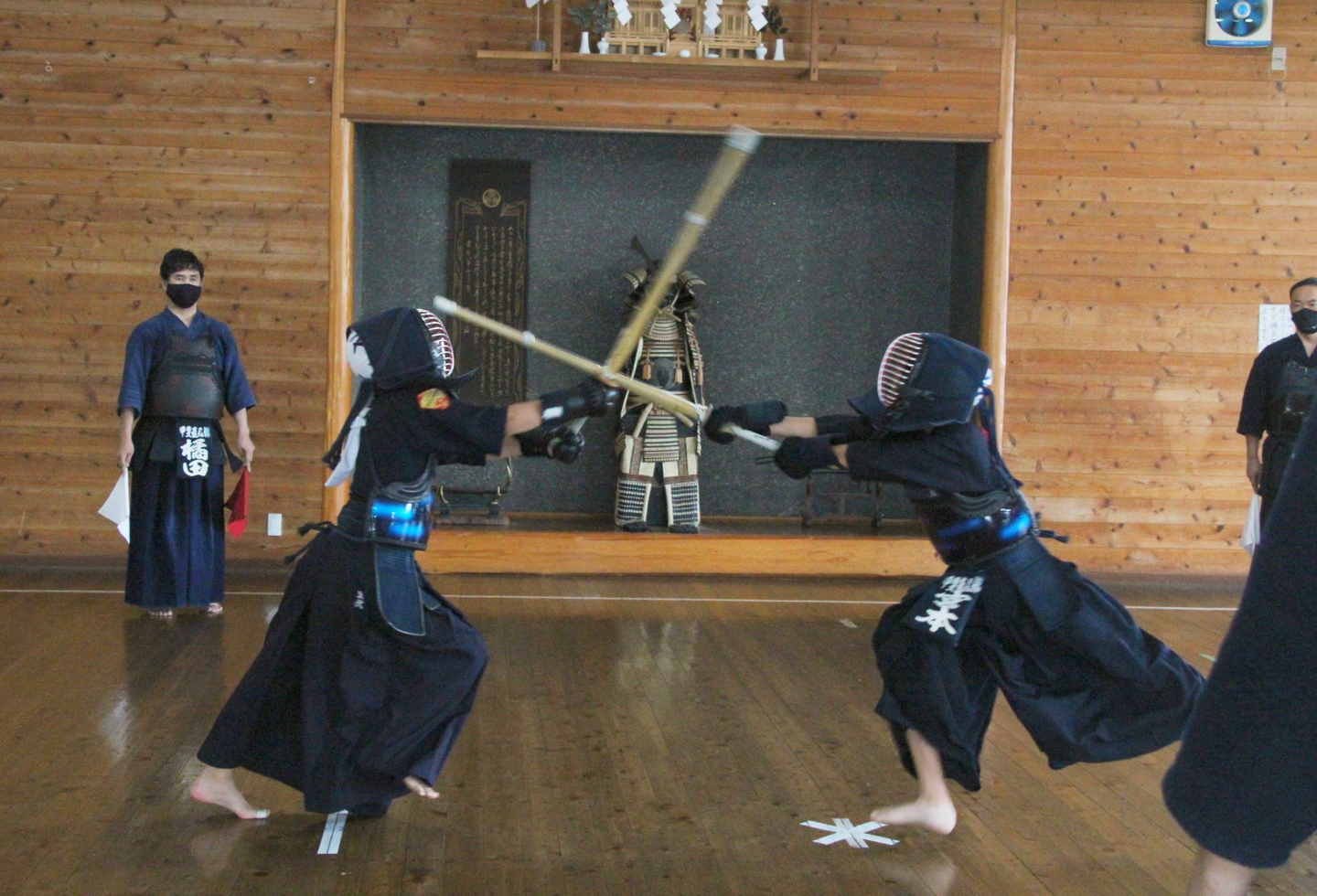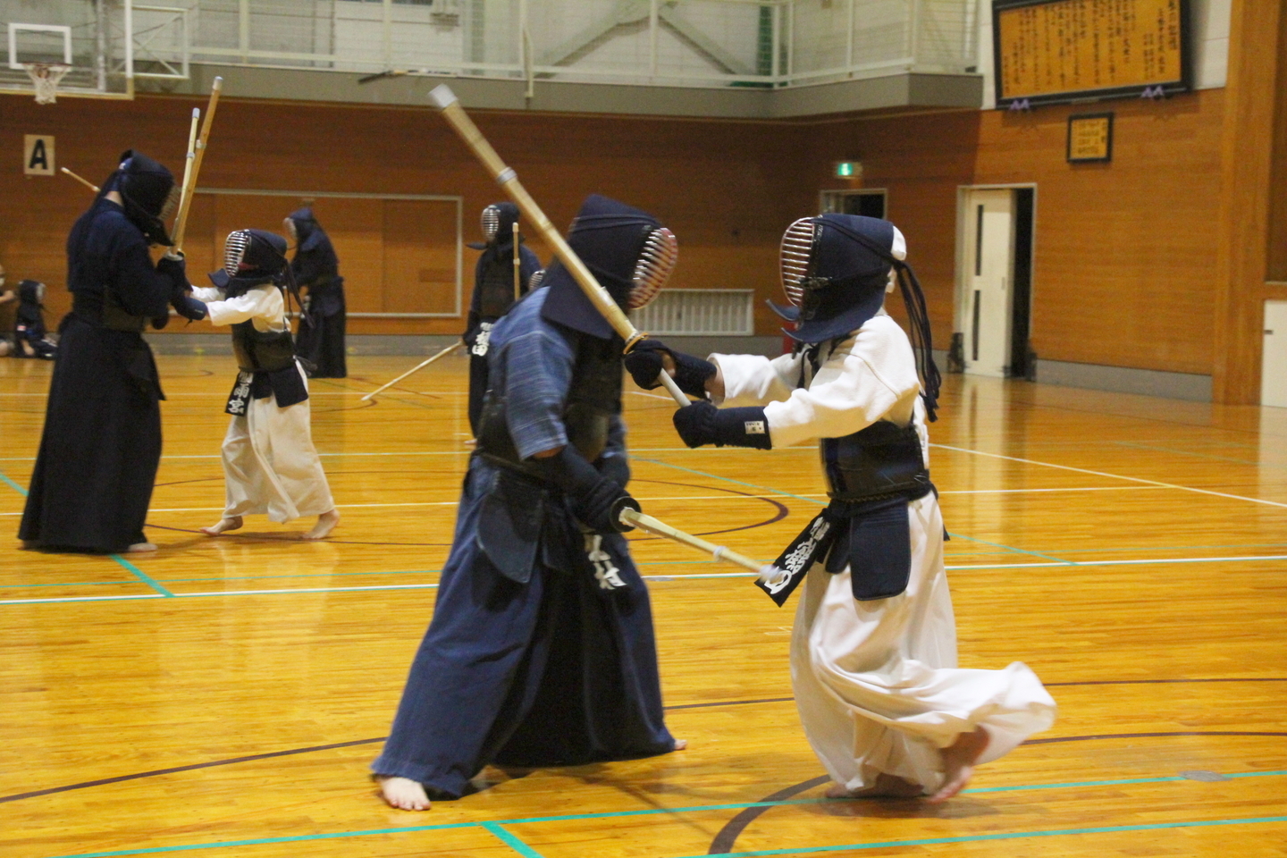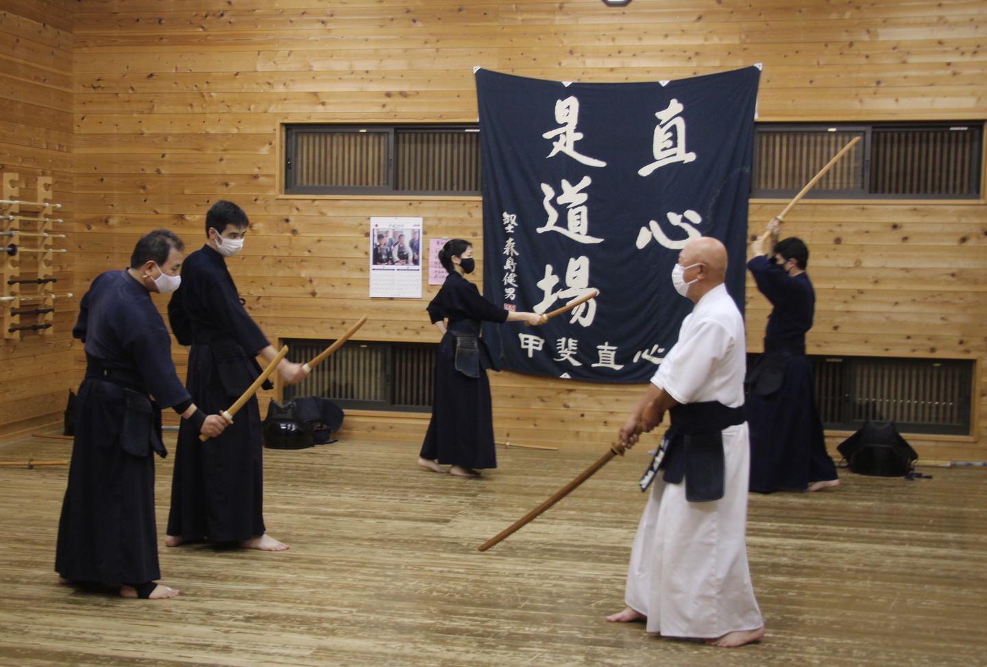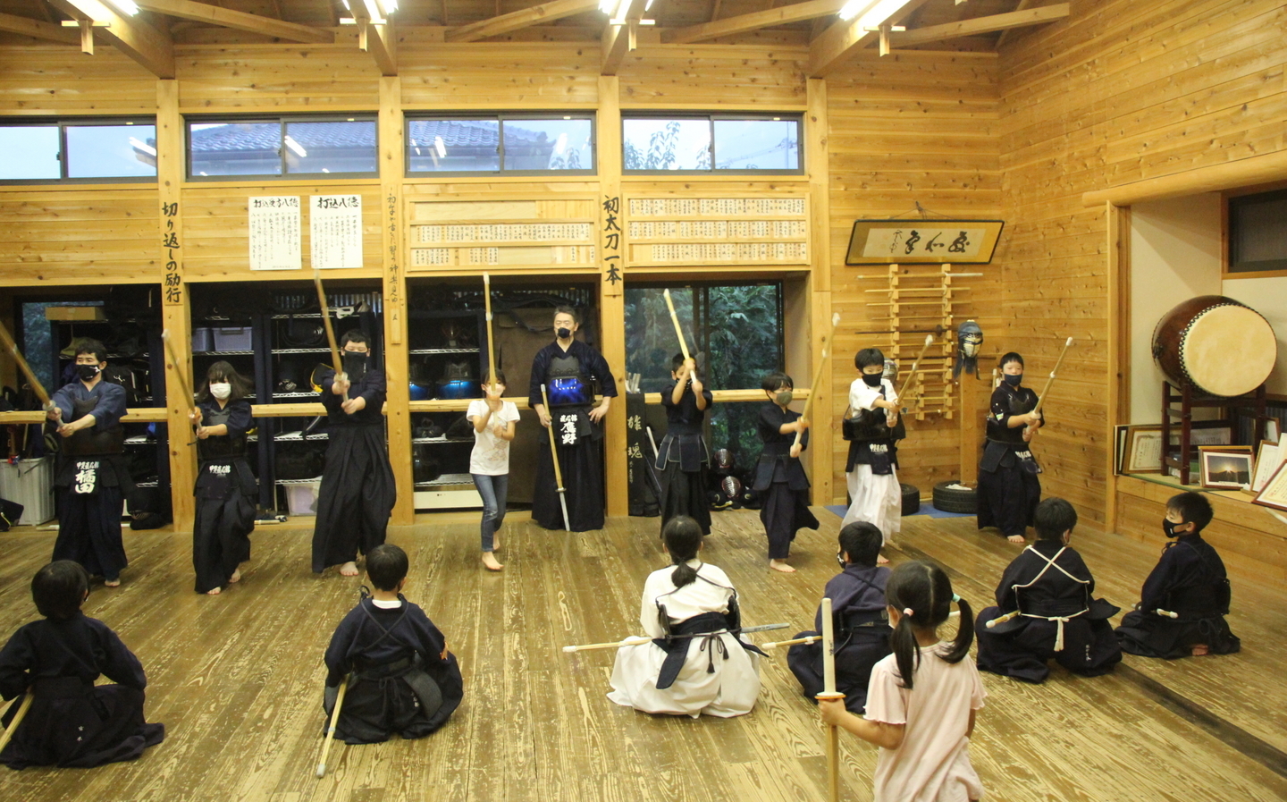 この日は足さばきを行い、前進後退正面素振り、前進後退左右面素振りに取り組み、順次、列ごとに発表しました。