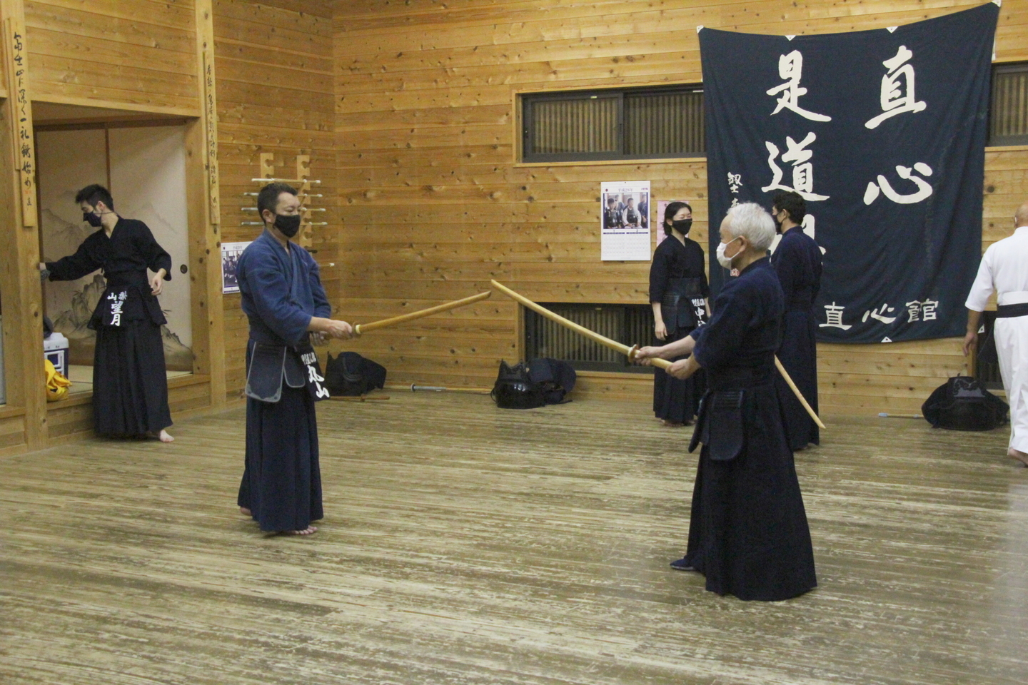 これまで4回の教室で学んできた足さばきと、三挙動の素振り、前進後退正面素振り、前進後退左右面素振りをおさらいし、前回に引き続き、跳躍面素振り(早素振り)を重点的に取り組みました。