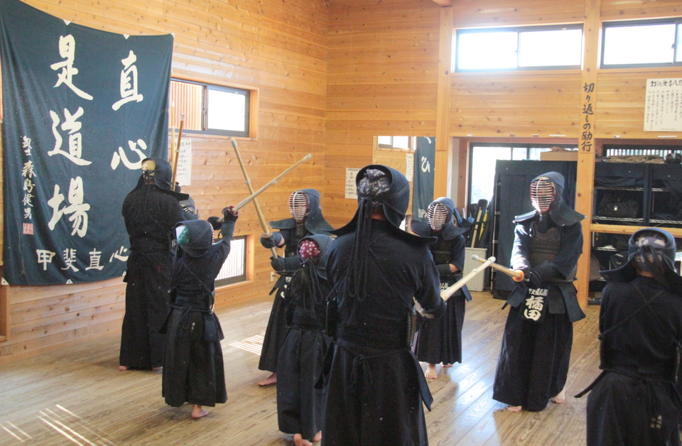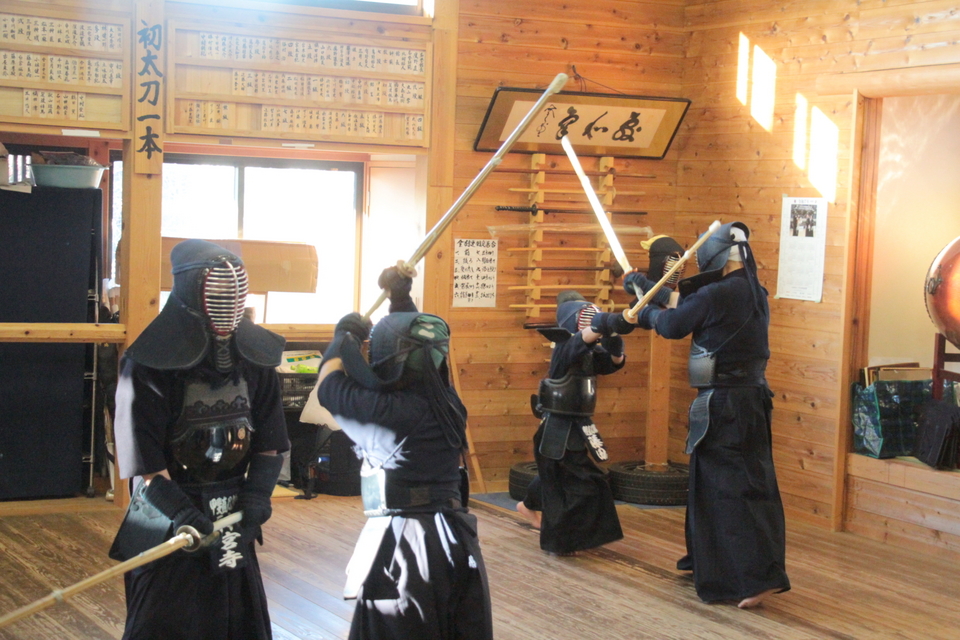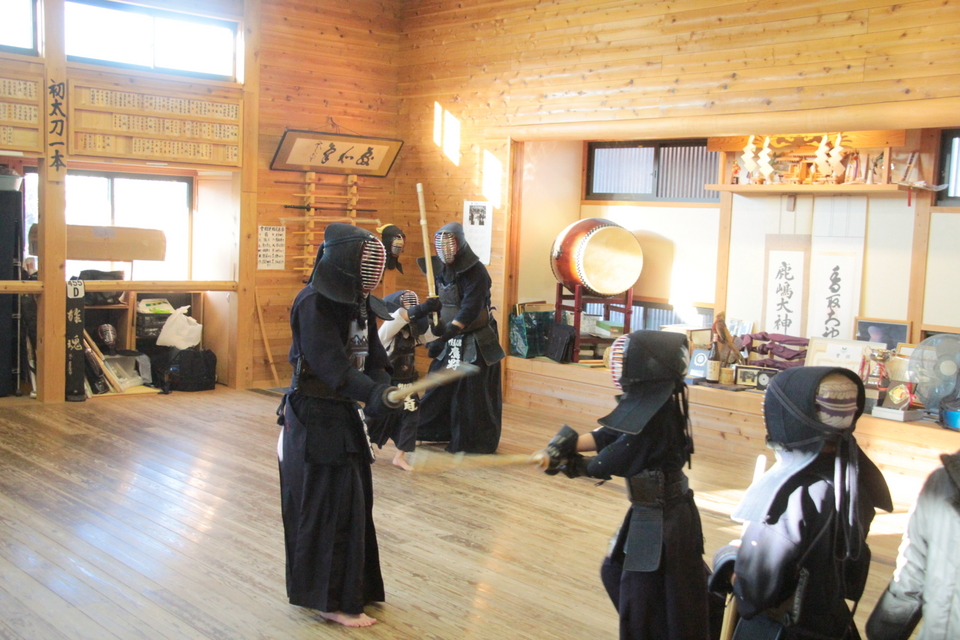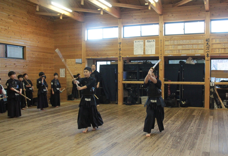 面着け後は切り返し、面打ちの後、相面、2人元立ちで体当たりを入れた連続6本打ちの技を稽古しました。腰を入れた体当たりができるようになると、左足の引きつけや引き技の冴えなど多くの技が向上していきます。指導者・一般元立ちで掛かり稽古を行いました。滑りやすい床で振り向いたときに転びそうになる人は足さばきをさらに磨くことが肝要です。最後に地稽古をして、今年一年間の修錬の跡を各自確認しました。