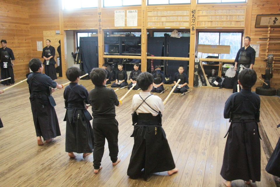 全員で足さばきを修錬しました。また、速い前進の連続正面素振りを6年生にお手本を見せてもらった上で、全員で行いました。送り足で左足が前に出てしまう癖が直らない館生がまだ少数います。二足一刀になってしまうと、振りが二拍子になってしまいがちです。