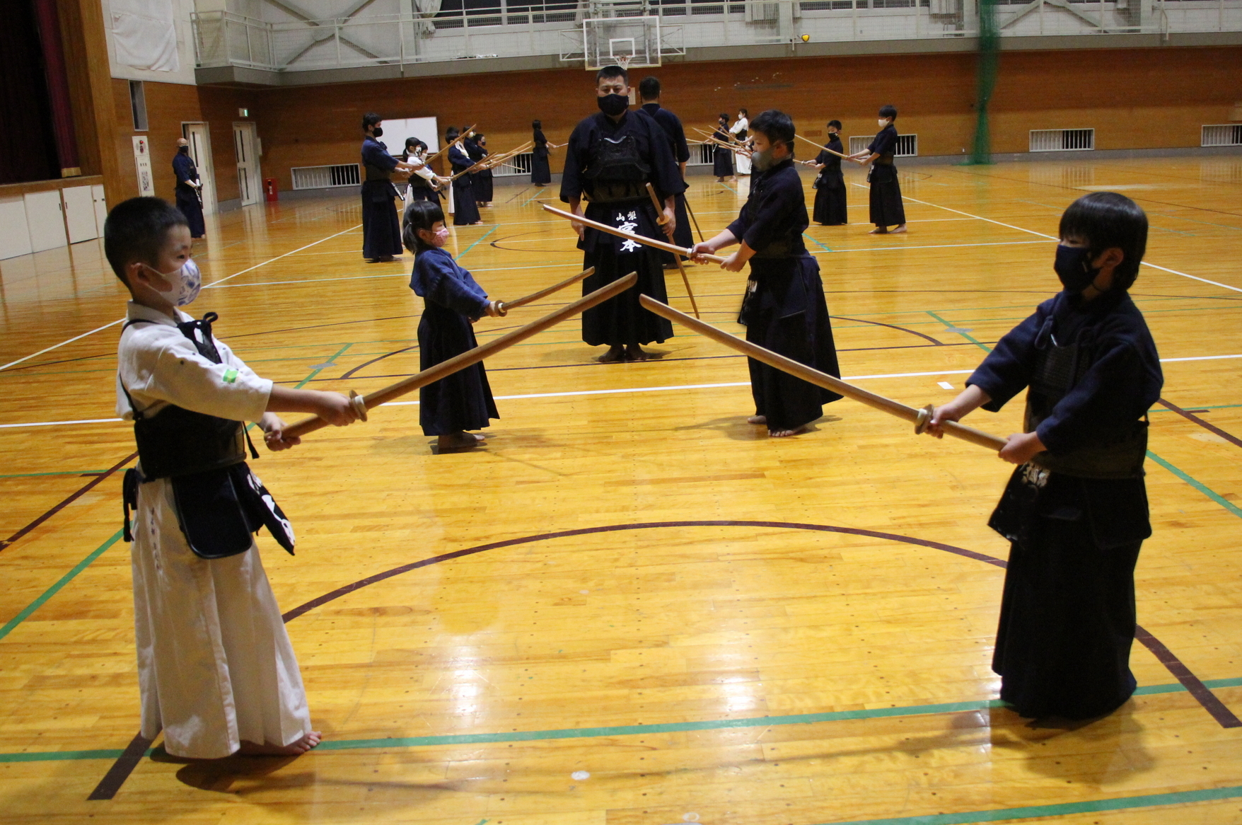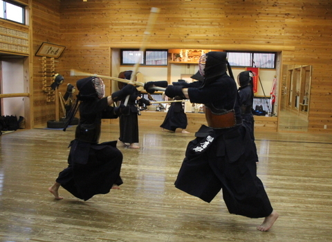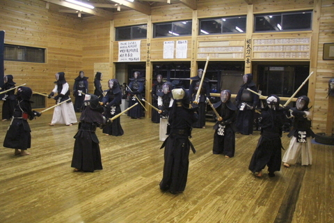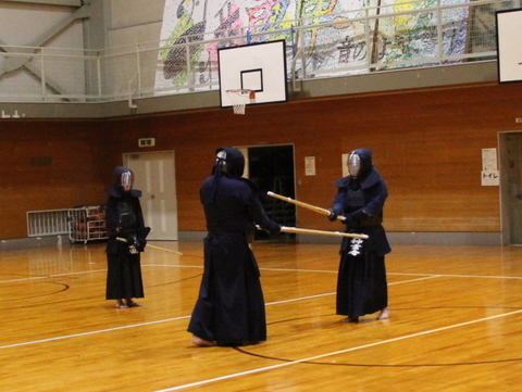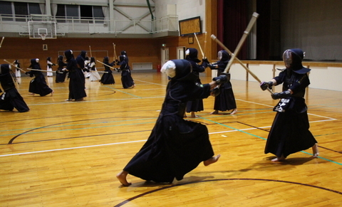 面着け後は15分間。面打ちや小手面打ち、小手胴打ち、小手面胴打ち、面面打ちなどを行い、面を着けているもの同士で立ち合いを2回だけ行い、切り返しをしました。また、参加者が面一本で稽古を締めました。