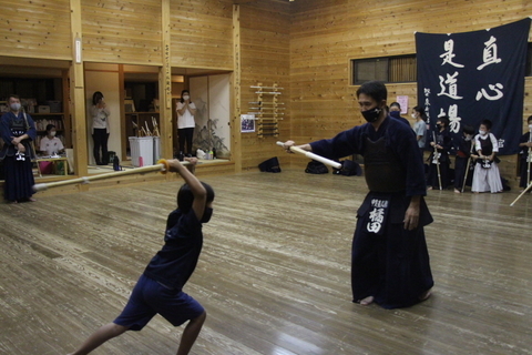 文化庁から委託を受けている伝統文化親子教室事業の第7回甲斐市親子剣道教室を10月9日、甲斐直心館道場で行いました。再開後、2週間続けての開催です。この日は延期された運動会が行われた小学校が複数ありましたが、甲斐直心館朝稽古に参加して、お昼からの運動会でも頑張り、夕方の親子教室も楽しいからと参加してくれた小学生もいました。ほかにも運動会後に参加した小学生もいました。親子で一緒に楽しく剣道を学ぶと上達の度合いが違います。