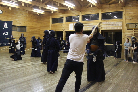 残り30分で面を着け、中学生も複数参加していましたので、切り返しを行った後、地稽古をしました。その後、大人と中学生がが元立ちになって、参加者の面打ちを受けました。この日初めて剣道着袴を身につけた小学1年生が「せんせい!」と駆け寄ってきてりりしい姿を見せてくれました。剣道着袴を身につけるだけで、別人のような印象です。実際、いつも面打ちが外れることが多かったのですが、この日はほとんど打ち損じもなく、移動の速さも圧巻でした。