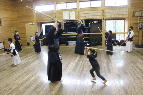 検温、手指消毒を済ませ、道場に礼をして入ると、早速、打ち込み台に向かって駆け出す小1男子や送り足の練習をする幼児ら、子どもたちは剣道が大好きです。「せんせい、ここはきもちいいい」と無垢材の杉の一枚板の感触がたまらない様子の幼児もいます。
