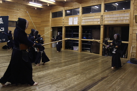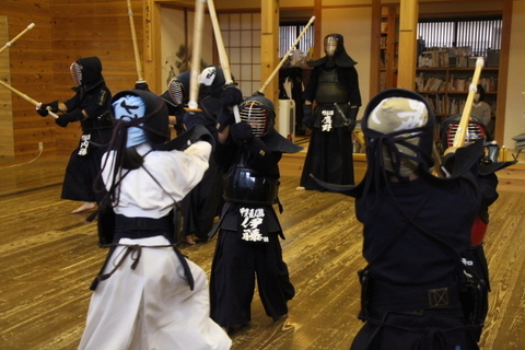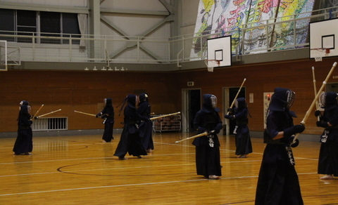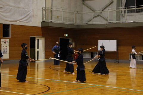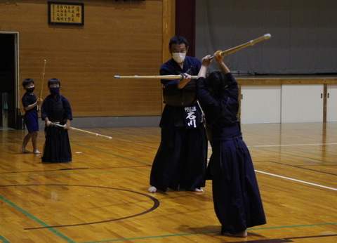 面を着けている小学生、指導者・一般で見取り稽古も兼ねて地稽古を2本行いました。経験者は中段の構えから、打つ前の動作をできるだけ少なくするにはどうしたらよいかを考えながら打ってみると上達が早くなります。