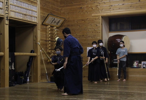 中段の構えから前進3歩、後退3歩の送り足の足さばきを行い、3〜5人ごとに全員に発表してもらいました。足さばきは剣道の根幹です。久々を感じさせない上達を見せてくれた参加者もいました。