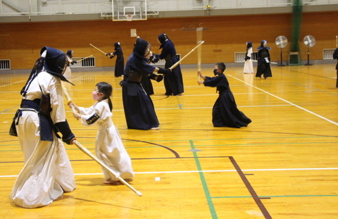 面着け後は基本打ちをして指導者と中学生元立ちによる打ち込み稽古をして、地稽古をし、高学年が元立ちで初心者の基本打ちを受けました。