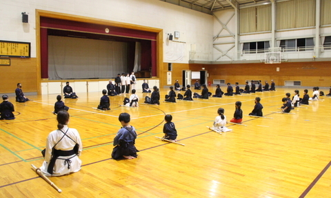 小学生の部の参加者は20人超。中学生の一部も2部に残って稽古していきました。号令は小6中村君。正座の後、14種類の素振りをしました。