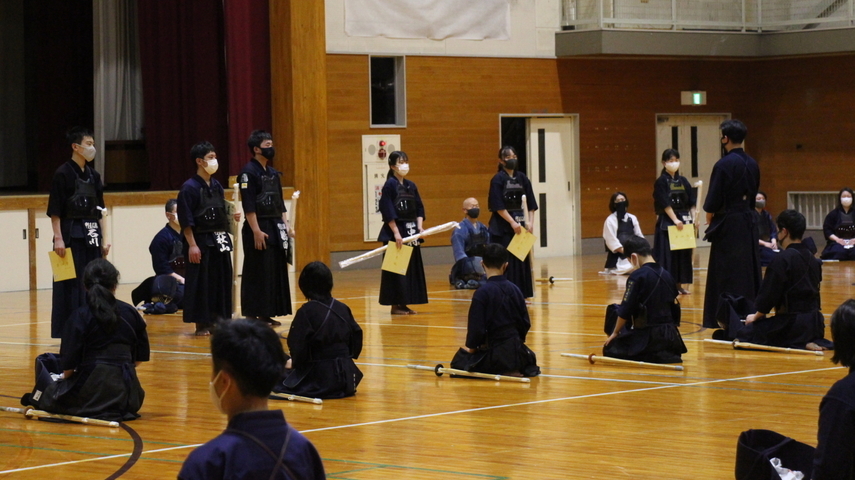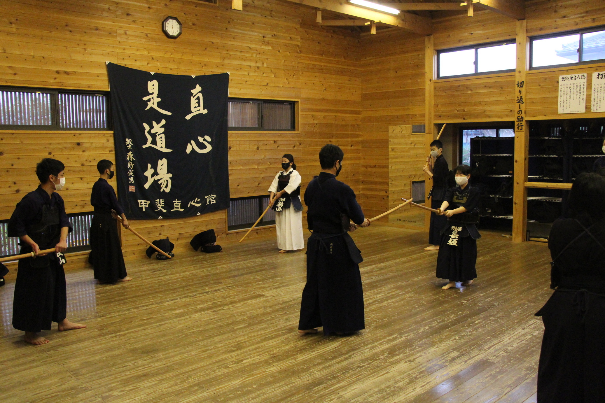 木刀から竹刀に持ち替え、前進の正面素振り、踏み込み面打ちを修錬して、攻め足と基本の動きを高めました。手と足が調和している修技者にみんなの前で披露してもらいました。