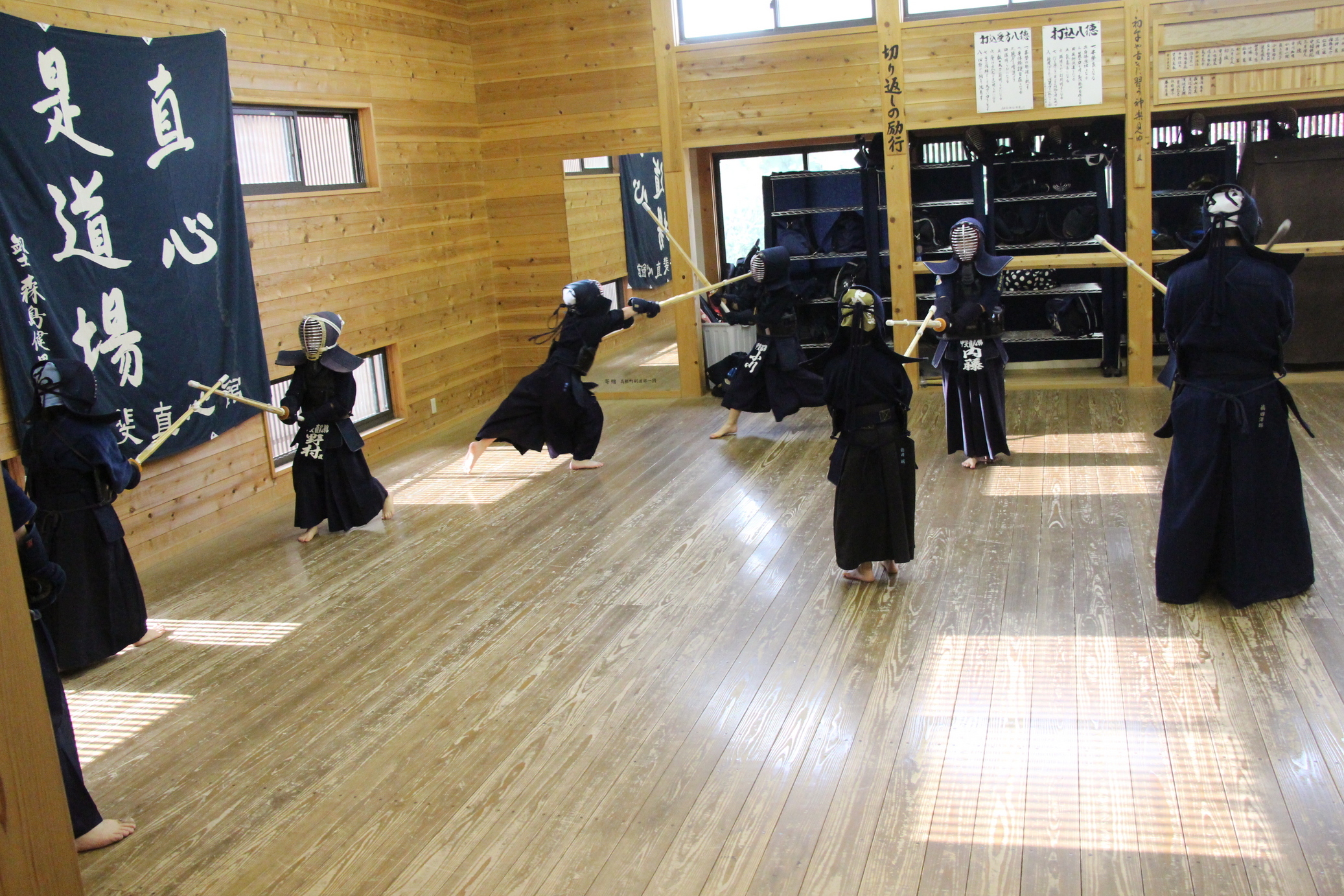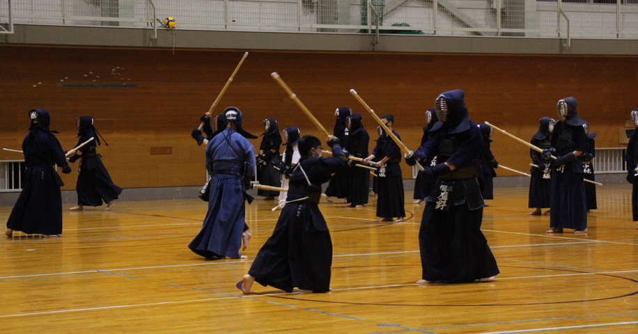 @上下素振りA大きな左右面素振り(開き足)B正面素振りC前後右左の足さばきで正面素振りD左右面素振りE前後右左の足さばきで左右面素振りF小手素振りG左右胴素振りH左手の片手素振りI右手の片手素振りJ股割り(腰割り)素振りK蹲踞素振りL跳躍正面素振りM跳躍左右面素振り−です。前進後退の足さばきが15aくらいと動きが小さい館生が数人いますので、腰を入れて70aくらいの前後の動きを求めました。