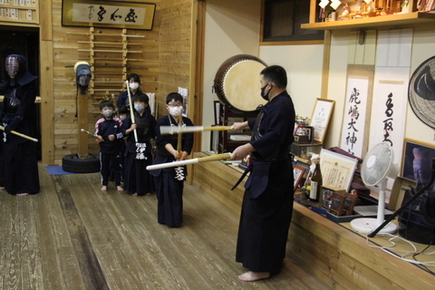 中学生の部の号令は中3鶴田君。正座の後、木刀で7種類の素振りをして、日本剣道形の稽古をしました。練度の違いで、3本目まで、5本目まで、7本目までとできる本数は様々です。全体に日本剣道形の稽古は十分ではなく、改善の余地がたくさんあります。審査のためのものという誤った認識ではなく、打つ機会や理合などを学ぶ、木刀による剣道基本技稽古法から一歩も二歩も進んだところでの意欲的な稽古を期待します。