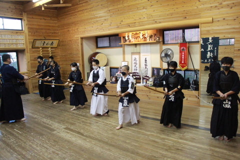 中学生の部の号令は中3石川君。正座の後、7種類の素振りを各20本。足さばき、前進の正面素振り、小手面素振りなどを修錬し、面着け後は面の打ち込み5本からの切り返し、大きく振りかぶっての面打ち、突くように入る面打ち、小手打ち、小手面打ちをしました。地稽古も行い、掛かり稽古、切り返し、面一本で締めました。