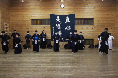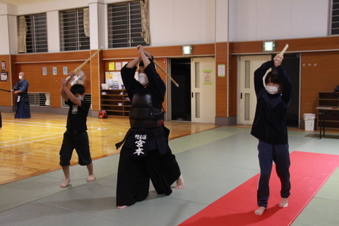 面着け後は面の打ち込み5本からの2往復切り返しをして、小手打ち、小手面打ち、相面、地稽古、切り返しで締めました。初心者組が基本打ちを披露しました。