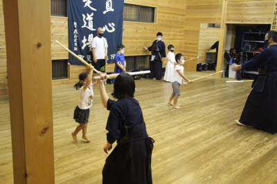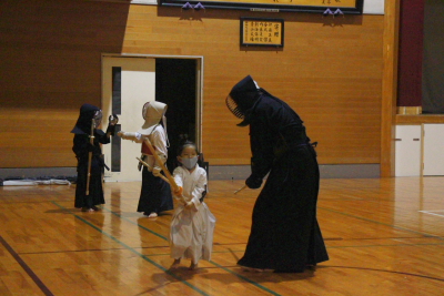 小学生は暑さも残っていたので面を着ける時間は最後の15分間に限定し、前半の20分は体育館半面を使ってジョギング、サイドステップ、スキップ、背走、全力走、歩み足走り、送り足などを競争も取り入れ、楽しみながら、スピード感も味わいました。