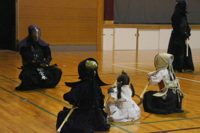 水分補給して面着け。面打ち、小手体当たりー引き小手ー小手体当たりー引き小手ー小手面打ち、面に対する応じ技、小手に対する応じ技、相面、切り返しをして締めました。小6小林君にお手本を見せてもらいながらの基本打ちは子どもたちにも刺激になるようです。