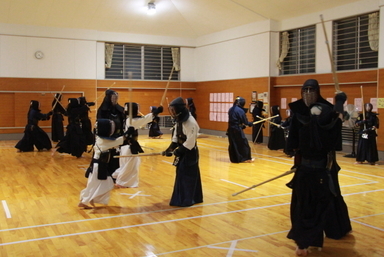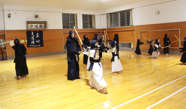 面着け後はすり足での切り返しを多めに行い、ここでも溜めを意識しました。相面の稽古をしました。試合稽古も、応じ技ではなく、相面のみ。合計4本有効打突があった時点で試合終了としました。この気持ちで試合に臨むと、いい試合ができるはずです。