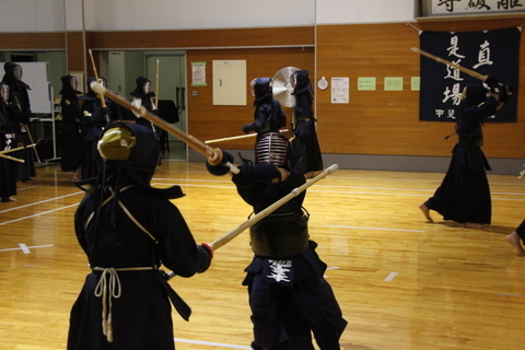 Aチームは2回戦で茨城県のチームに錬成判定で2−1、2−1、2−1、3−0、3−0と5人全員が勝利し、一本勝負は2勝2敗の計7勝2敗(本数14−5)という成績でした。切り返しと打ち込みの判定での全員勝利は、基本を大切にしている甲斐直心館にとって自信を深めるうれしい内容です。5人全員が応じ技もほぼすべて決めてくれました。