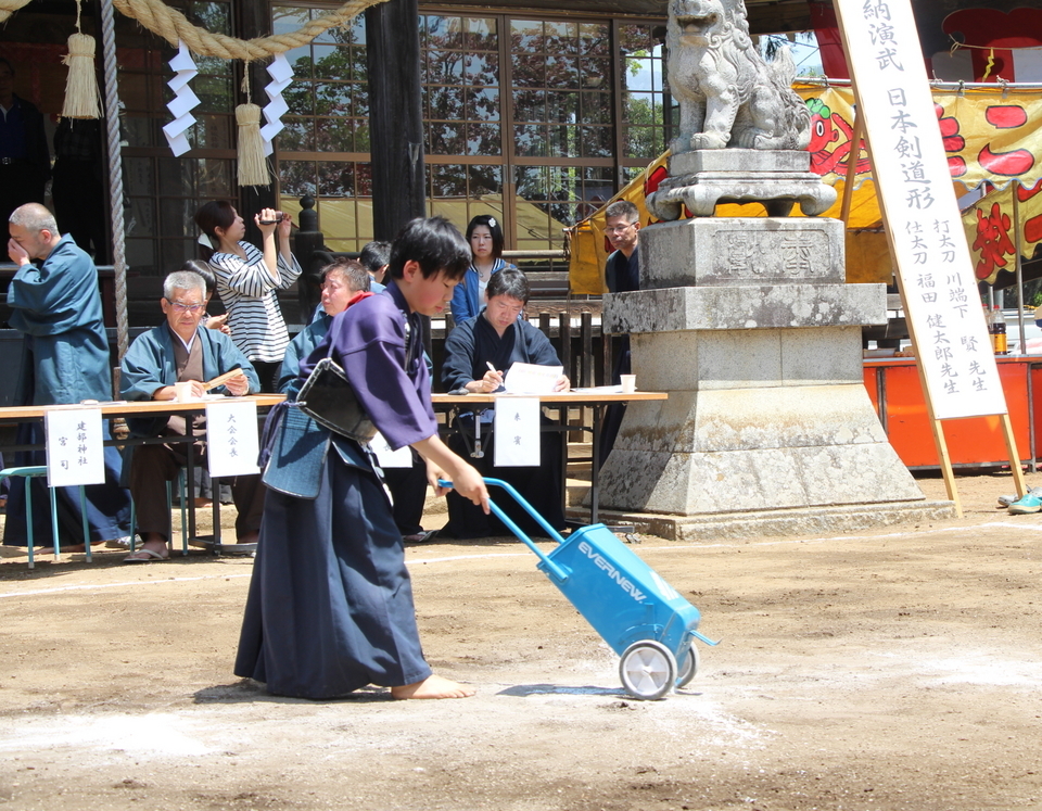 境内の土の上で、はだしで試合を行う数少ない奉納剣道大会です。屋外の暑さもあり、たいへんな試合でもありますが、選手は大きな声で素晴らしい技を繰り出していました。「神様は賑やかな境内を好む」と、むしろ大きな声援を選手に送ってほしいというユニークな大会です。素晴らしい技や、大きな気合に、大いに盛り上がりました。