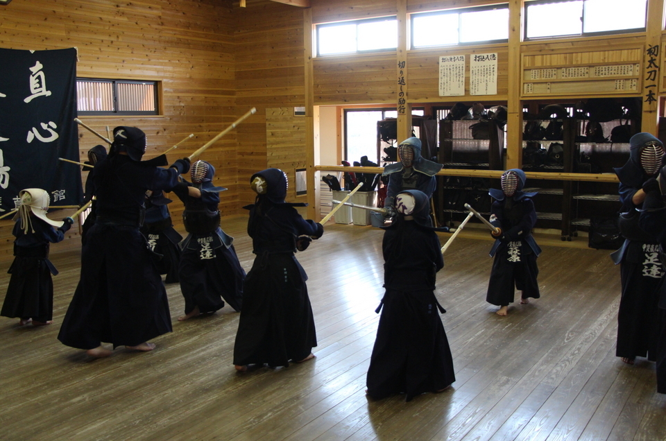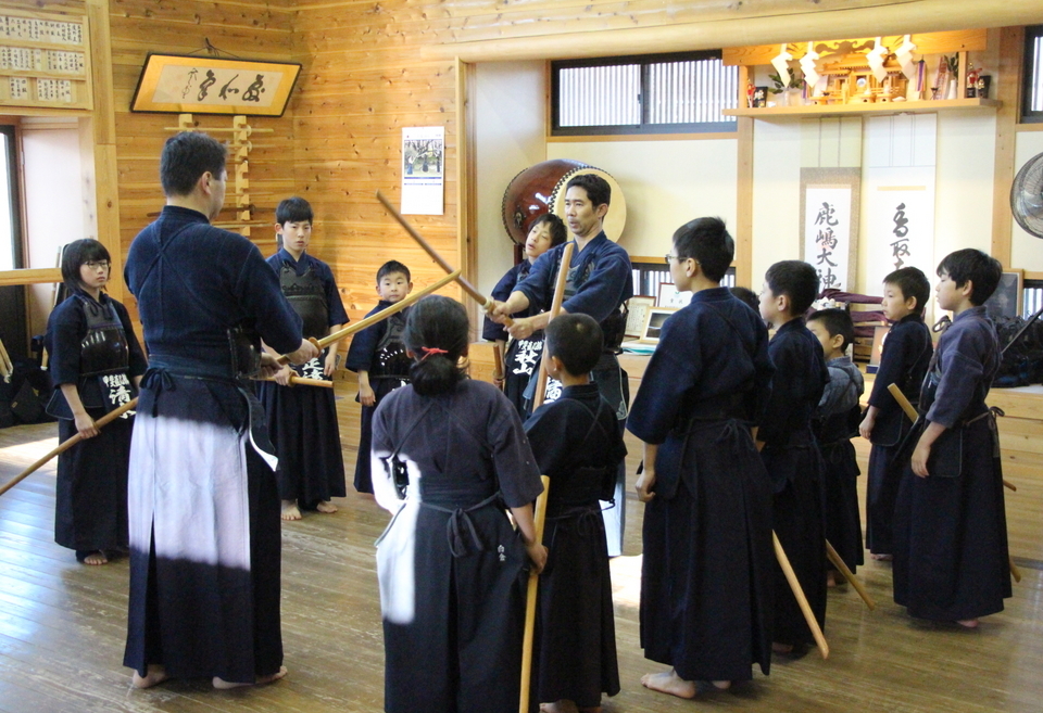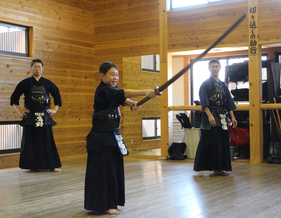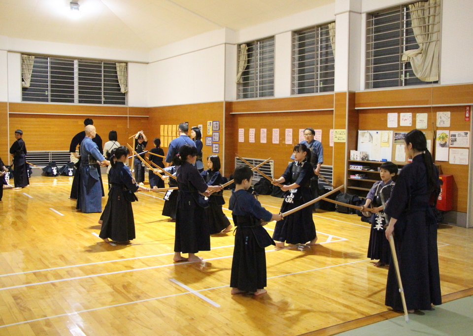 参加者が少なめのせっかくの機会ですので、一人一人に大木刀での素振りを経験してもらいました。身長よりも大木刀が長い低学年の館生もいました。手首を痛めないよう全身を使って振るように助言しました。全身を使って一拍子で振ることを覚えると、普段の竹刀、木刀での振りが変わってきます。