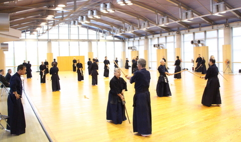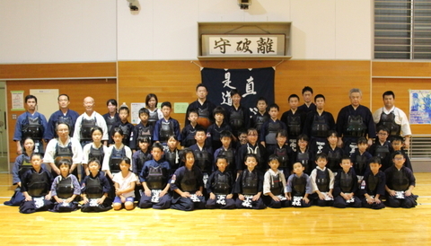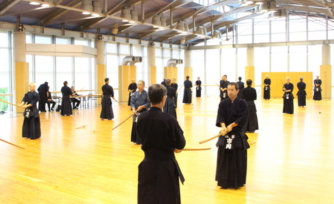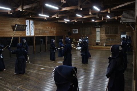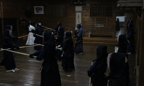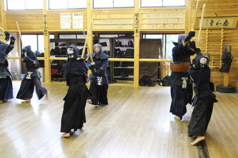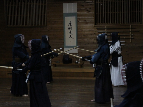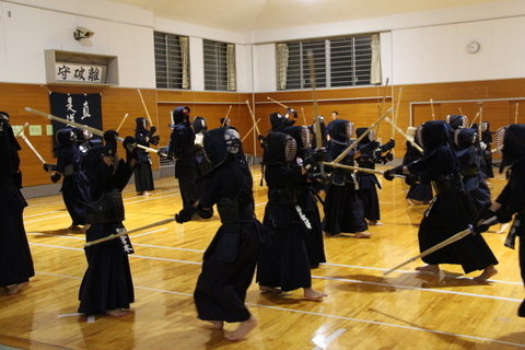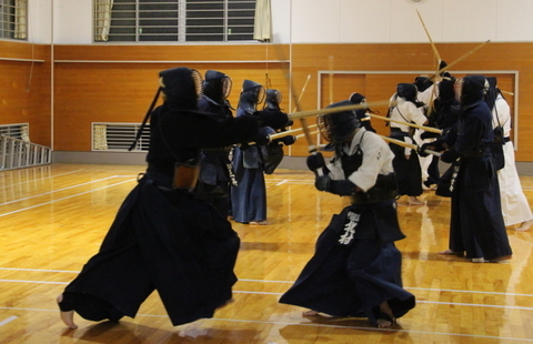 面着け後はまず跳躍素振り100本を行った後、相互の面打ち、相互の小手面打ち、面体当たり引き面、小手面体当たり引き胴、面の打ち込み、相面、面に対する応じ技、小手に対する応じ技を行い、地稽古を3回行いました。